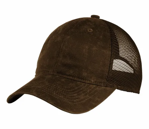 Fabric: 67/33 cotton/poly front panels; 100% polyester mesh mid and back panels Structure: Unstructured Profile: Low Features: Pigment print gives an oiled leather look Closure: Hook and loop