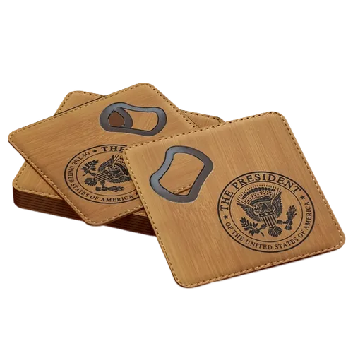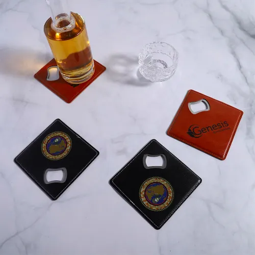 - Get your own Leather Bottle Opener Coaster. Enhance your way of giving gifts and promoting your businesses. Through this new coaster, you can create your own layout for the design that will stay on display at homes, restaurants, bars, and other plans you can think of. This multipurpose coaster can be an adornment and at the same time protects tabletop from water marks. Personalize your coaster now and make an impact!