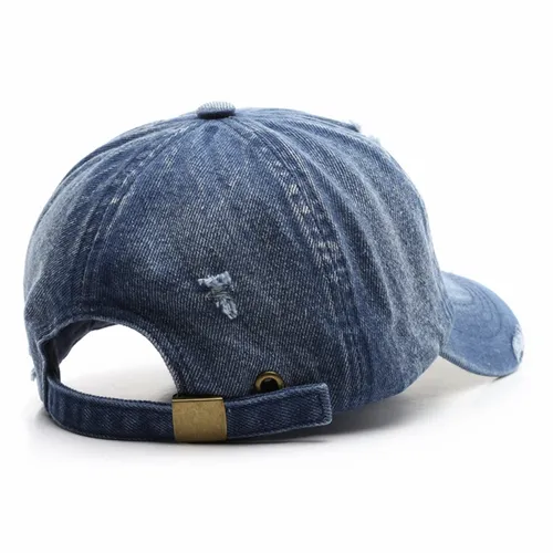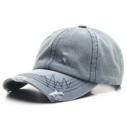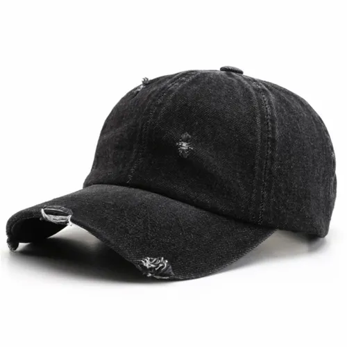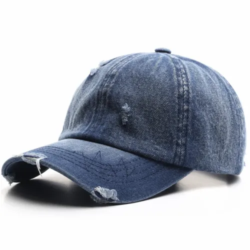 This type of hat is made of denim material and features a tattered or distressed design. The cap typically has a structured crown and a pre-curved visor or brim at the front, similar to a traditional baseball cap. The current tattered denim cap is a popular choice among those who are looking for a unique and unconventional look.